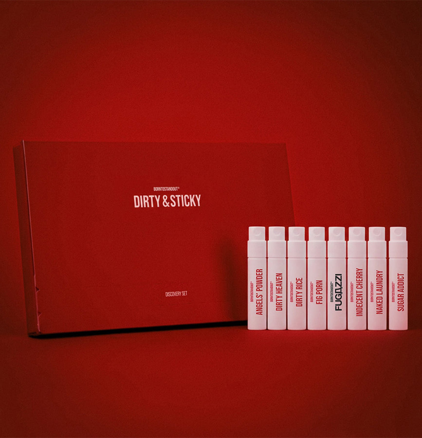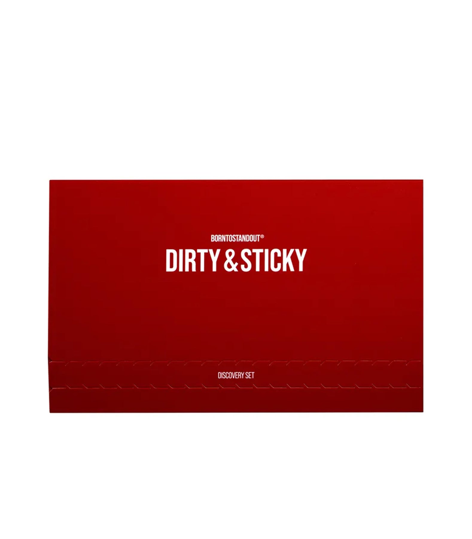 The BORNTOSTANDOUT® DIRTY & STICKY Discovery Set, featuring eight of the BORNTOSTANDOUT® signature scent compositions.
